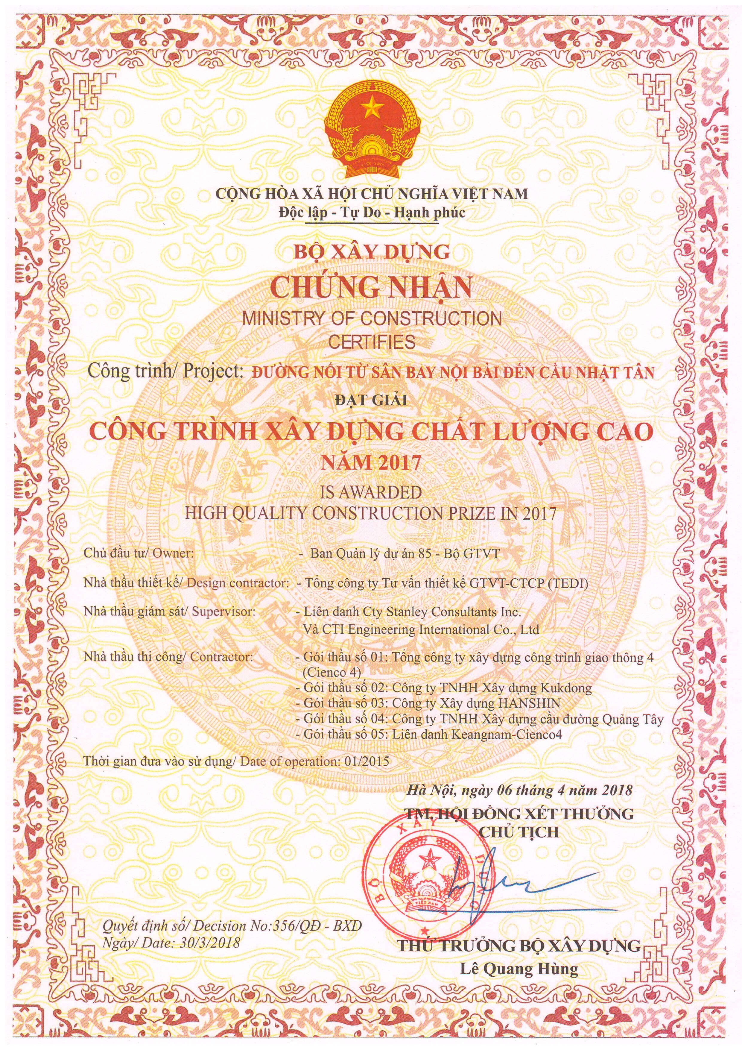 2017年获越南精品质量工程建设奖